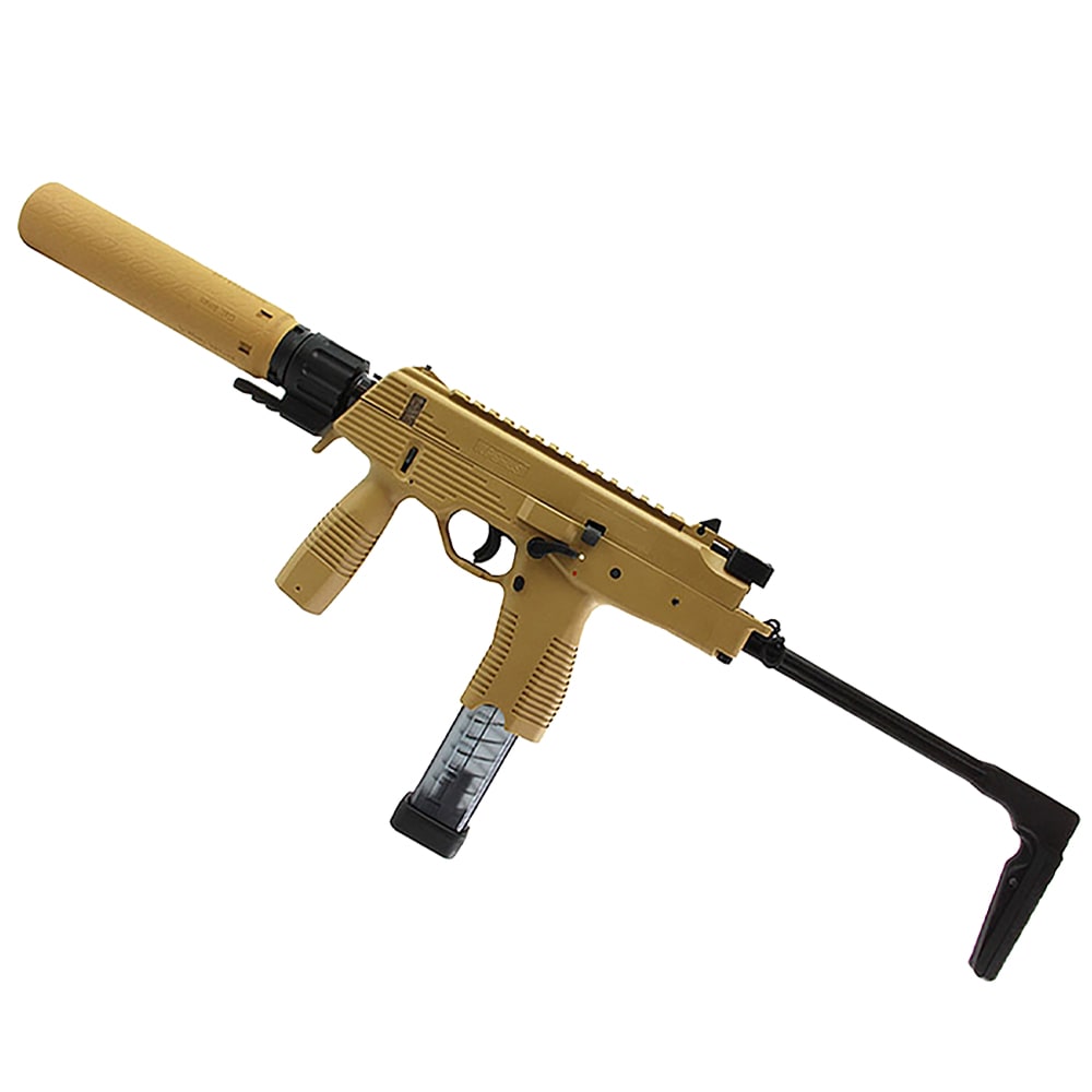 The B&T TP9-SBR is the semiautomatic version of the MP-9-N. It features a smaller frame when compared to other weapons in its class. The TP9 sports a top mounted picatinny rail with plenty of rail space for mounting a wide range of optics as well as two side mounted rails for the installation of lights and lasers. It also has low profile back up iron sights in the form of a fixed front post sight and a windage adjustable rear peep sight. The safety switch is ambidextrous and easy to engage/disengage. The charging handle is reminiscent of the AR-15, and in the event the handle gets stuck, there is a hold cut into the slide: insert a 9mm round into the hole and use it to safely cock/clear the weapon. In addition, the TP9-SBR is outfitted with a minimalist side-folding stock and a foregrip for greater accuracy at medium range, as well as a suppressor.