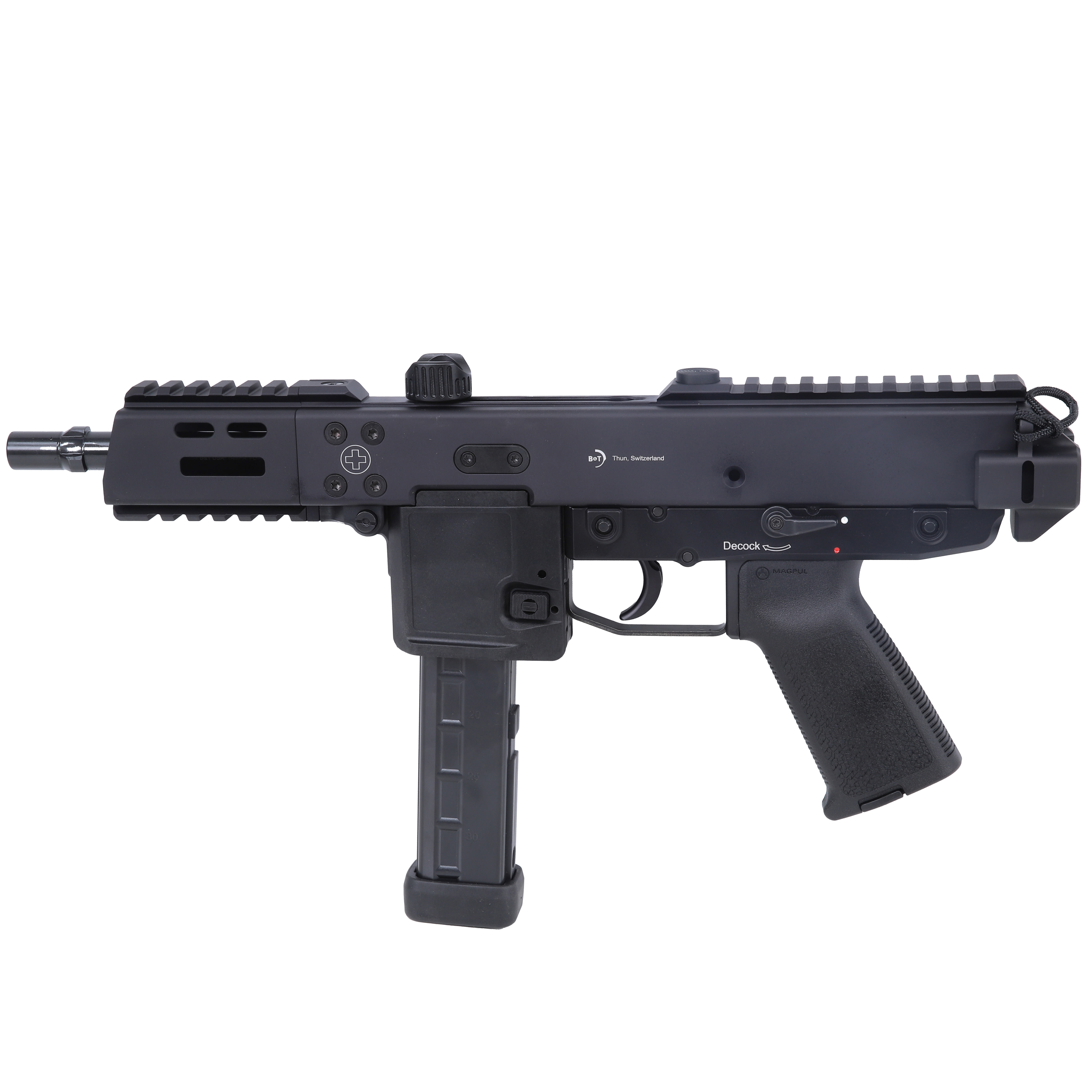 The B&T KH-9 Covert ships with one factory magazine (most commonly a 30-round magazine, though some packages list a 25-round), and is a closed-bolt, blowback, semi-automatic pistol with a DA/SA trigger and decocker. Its finish is black — hard-anodized aluminum on the upper with a polymer lower — and its typical magazine capacity is 30 rounds. The barrel does not use a conventional threaded muzzle; instead the Covert uses a tri-lug/quick-attach interface intended for suppressors and dedicated muzzle devices (adapters to standard threads are available separately if you require them).