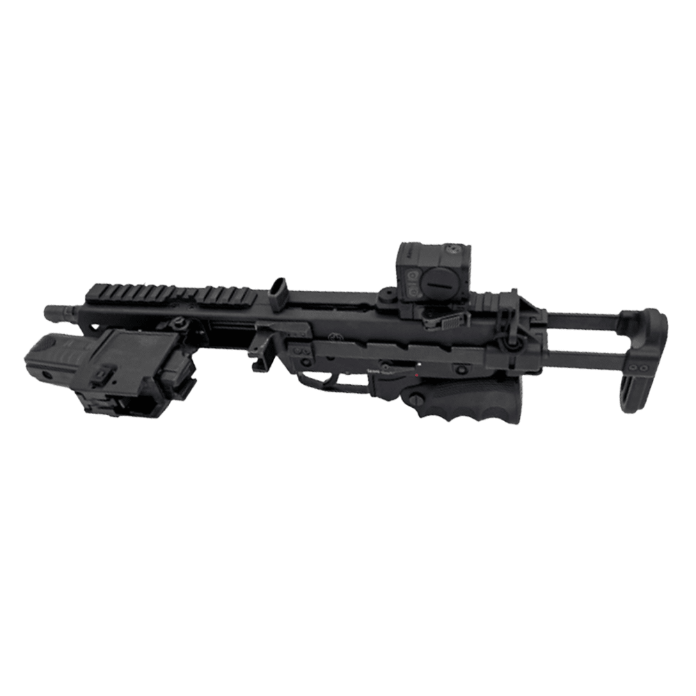 The B&T KH9‑S 9×19mm Tele‑Brace Pistol is a compact, Swiss-engineered personal defense pistol inspired by classic submachine-gun styling and modernized for reliability and portability. Chambered in 9×19mm, it features a 6in barrel with a 1:10 twist rate and utilizes a distinctive side-mounted, detachable magazine system that helps keep the profile slim while maintaining balance during operation. The pistol is built around a robust, precision-machined receiver and includes a telescoping brace for improved control, flip-up iron sights for quick target acquisition, and a 25-round magazine for extended shooting capability. Designed with modularity and transport in mind, the KH9-S ships with a dedicated sling bag for discreet carry, making it well suited for defensive, duty, or collector applications where compact performance and premium craftsmanship are desired.