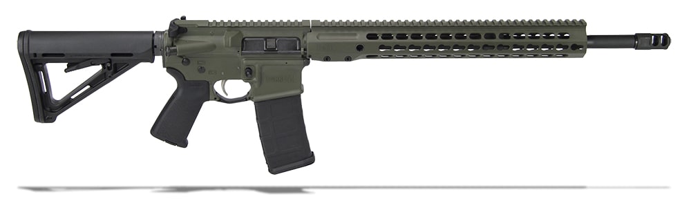 This 5.56 NATO Barrett REC7 Gen II direct impinged rifle features a 18" DMR barrel, olive drab green receiver, Magpul MOE stock, Barrett handguard, muzzle brake, Bravo Company charging handle, ALG Defense ACT Trigger, KeyMod rail attachment, and one 20 round magazine.