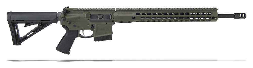 This 6.8 SPC Barrett REC7 Gen II direct impinged rifle features a olive drab green receiver, Magpul MOE stock, Barrett handguard, muzzle brake, Bravo Company charging handle, ALG Defense ACT Trigger, KeyMod rail attachment, and one 30 round magazine.