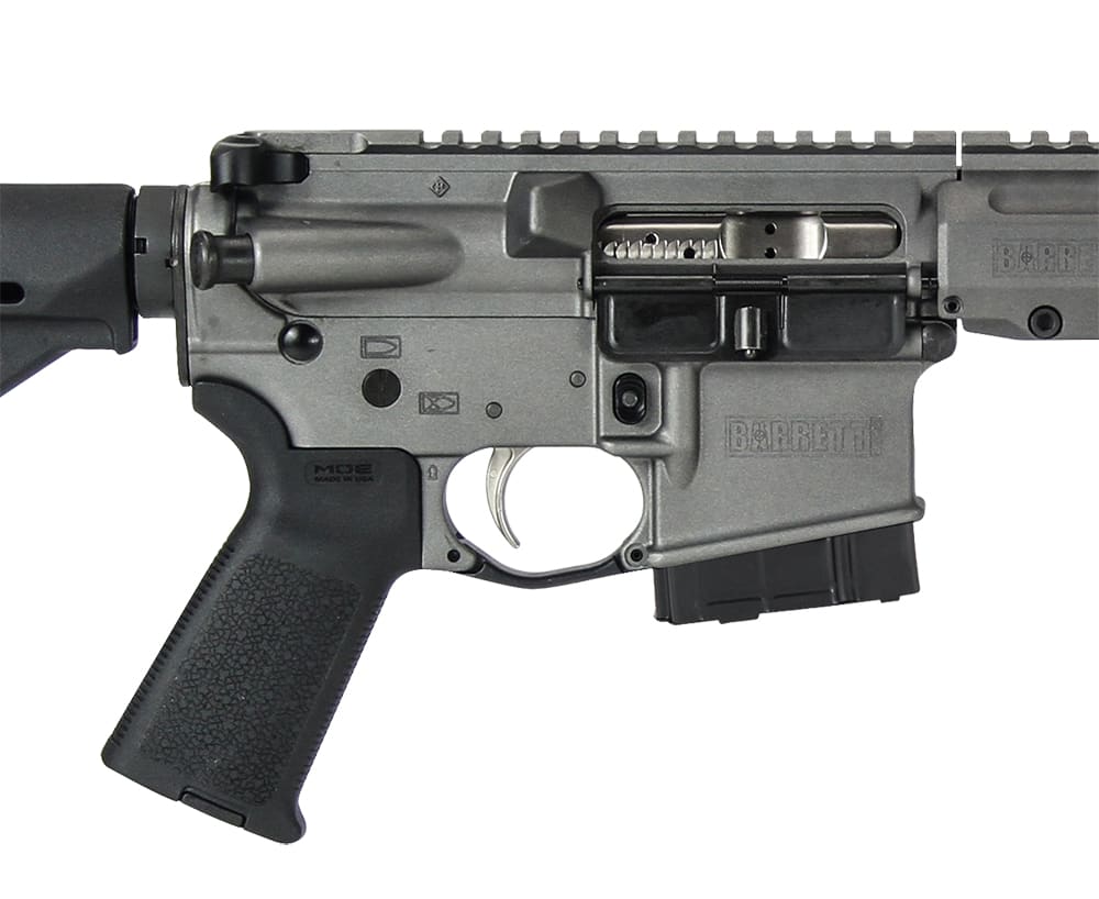 This 6.8 SPC Barrett REC7 Gen II direct impinged rifle features an 18" DMR barrel, tungsten grey receiver, Magpul MOE stock, Barrett handguard, muzzle brake, Bravo Company charging handle, ALG Defense ACT Trigger, KeyMod rail attachment, and one 20 round magazine.