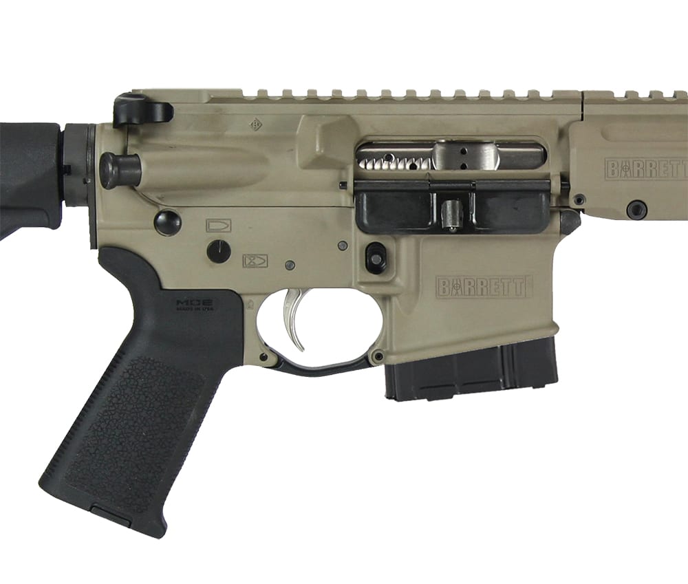 This 6.8 SPC Barrett REC7 Gen II direct impinged rifle features an 18" DMR barrel, flat dark earth receiver, Magpul MOE stock, Barrett handguard, muzzle brake, Bravo Company charging handle, ALG Defense ACT Trigger, KeyMod rail attachment, and one 20 round magazine.