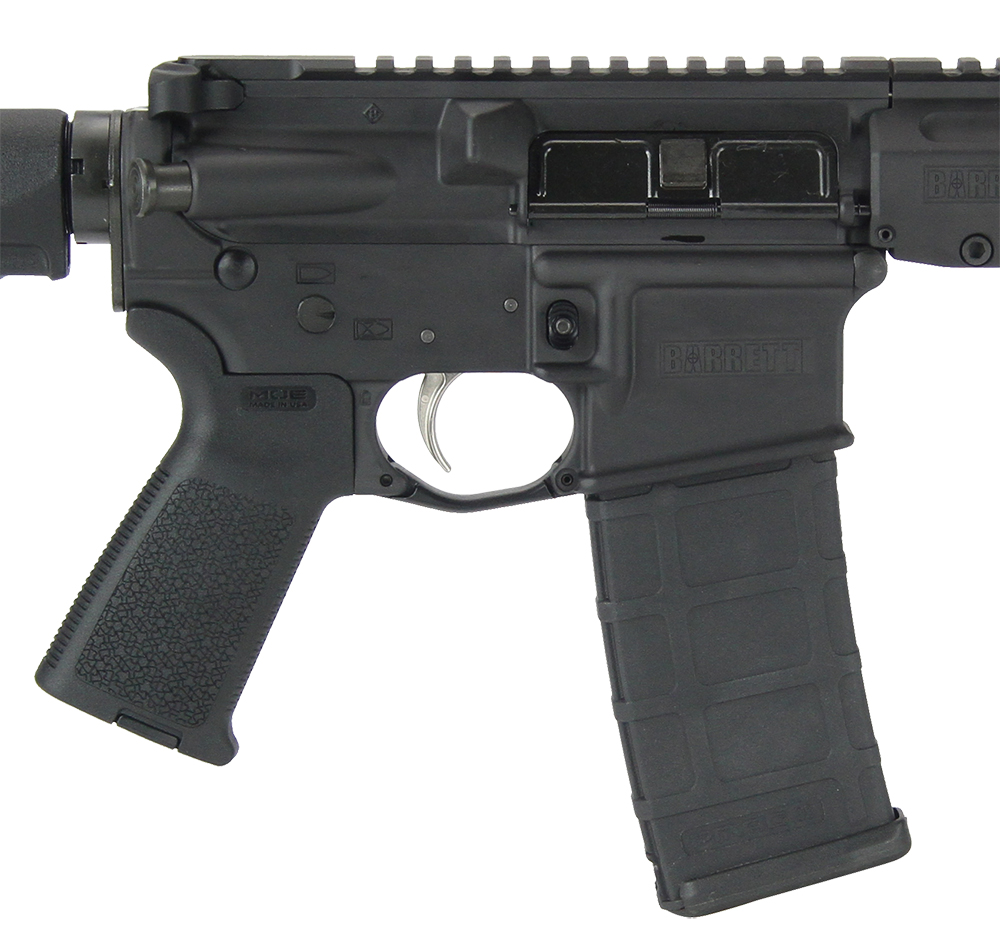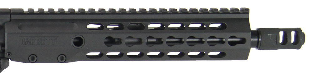 This .300 Blackout Barrett REC7 Gen II direct impinged rifle features an 10.5" barrel, black receiver, Magpul MOE stock, Barrett handguard, muzzle brake, Bravo Company charging handle, ALG Defense ACT Trigger, KeyMod rail attachment, and one 30 round magazine.