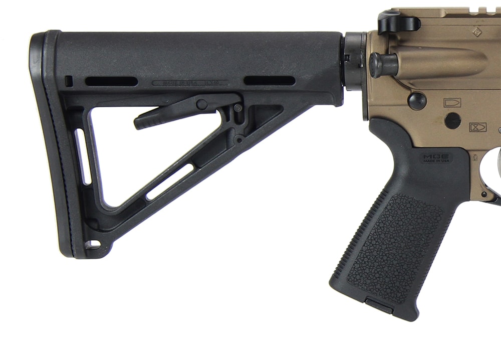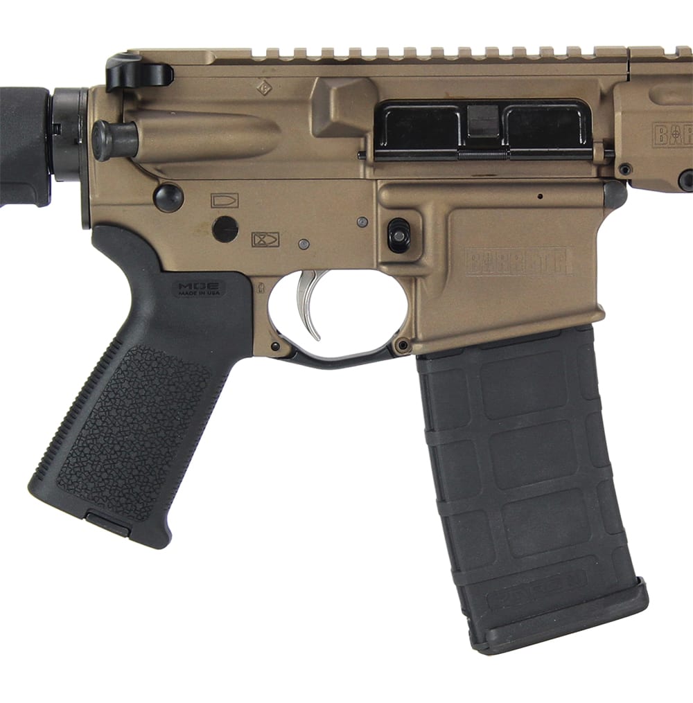 This .300 Blackout Barrett REC7 Gen II direct impinged rifle features an 10.5" barrel, burnt orange receiver, Magpul MOE stock, Barrett handguard, muzzle brake, Bravo Company charging handle, ALG Defense ACT Trigger, KeyMod rail attachment, and one 30 round magazine.