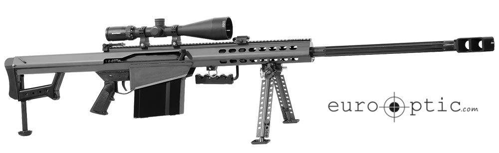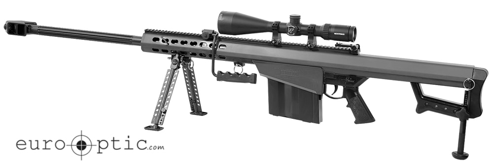 The Barrett M82A1’s semi-automatic action relies on a rotating recoil operated bolt and is available with a 20” CQB barrel or 29” long range barrel. M82A1 rifles chambered in .416 Barrett exclusively use a 29” barrel. The receiver is made from steel to ensure unparalleled durability and also to add significant weight to mitigate the powerful recoil of the .50 BMG cartridge. Barrett M82A1 rifles ship with a lightweight quick-detach bipod that allows you to fire the rifle from a supported or prone position. .50 BMG Barrett M82A1s use an arrowhead shaped 2-port muzzle break for recoil mitigation and the .416 barrel M82A1s use a cylindrical 3-port muzzle break. M82A1 comes standard with a 23” Picatinny with a 27 MOA cant.