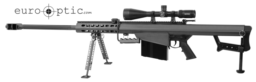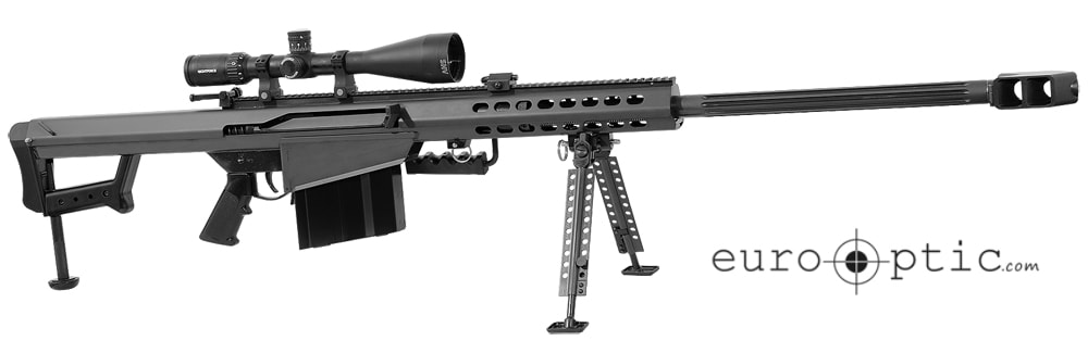 The Barrett M82A1’s semi-automatic action relies on a rotating recoil operated bolt and is available with a 20” CQB barrel or 29” long range barrel. M82A1 rifles chambered in .416 Barrett exclusively use a 29” barrel. The receiver is made from steel to ensure unparalleled durability and also to add significant weight to mitigate the powerful recoil of the .50 BMG cartridge. Barrett M82A1 rifles ship with a lightweight quick-detach bipod that allows you to fire the rifle from a supported or prone position. .50 BMG Barrett M82A1s use an arrowhead shaped 2-port muzzle break for recoil mitigation and the .416 barrel M82A1s use a cylindrical 3-port muzzle break. M82A1 comes standard with a 23” Picatinny with a 27 MOA cant.