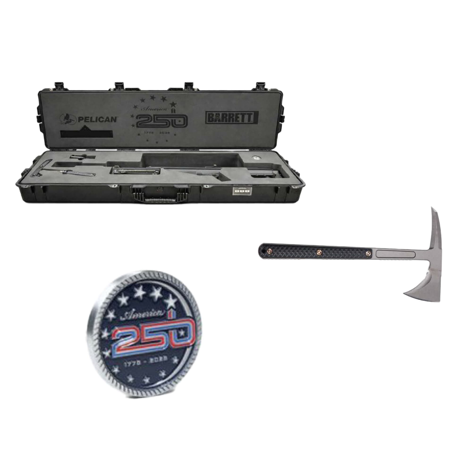 The Barrett M107A1 America 250 Series Anniversary Edition is a triumphant celebration of 250 years of American history, pairing one of the world's most iconic long-range rifles with an exclusive collector's package worthy of its legendary status. Chambered in .50 BMG with a 20-inch barrel and 1:15 right-hand twist rate, the M107A1 delivers devastating accuracy and battle-proven reliability that has made Barrett the undisputed leader in large-caliber semi-automatic rifle design. The lightweight folding adjustable stock, mil-spec Picatinny rail, right-side thumb safety, and single-stage trigger ensure this rifle is as field-ready as it is collectible. This anniversary edition arrives complete with an RMJ Tactical Kestrel Tomahawk, an exclusive commemorative challenge coin, and a rugged Pelican hard case. Limited in availability and extraordinary in every detail, the M107A1 America 250 Series is a once-in-a-generation tribute to American craftsmanship and the enduring legacy of Barrett Firearms.