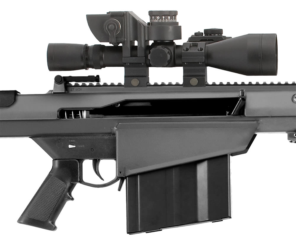 This Barrett M107A1 .50 BMG rifle system has a 29" fluted barrel, Black Cerakote receiver, Leupold Mark 4 M1 scope, BORS, and Barrett ultra high rings. Due to combat demands, this rifle is lighter than the original M107A1 yet just as strong. Other features include a thermal cheek guard, back up iron sights, suppressor-ready bolt carrier, modular rear hand grip, and a Sorbothane recoil pad.