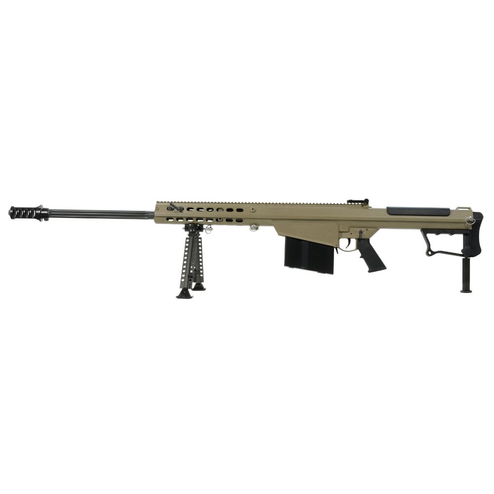 This Barrett M107A1 50 BMG rifle has a tan Cerakote receiver and a 29" fluted barrel. Features include a suppressor-read muzzle brake, lightweight quick-detach bipod with modular feet, easily accepts mil-1913 accessory rails, thermal cheek guard, and a modular handgrip mounted on a mil-1913 rail.