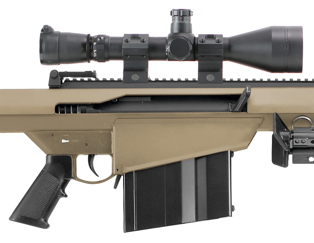 The Barrett M82A1’s semi-automatic action relies on a rotating recoil operated bolt and is available with a 20” CQB barrel or 29” long range barrel. M82A1 rifles chambered in .416 Barrett exclusively use a 29” barrel. The receiver is made from steel to ensure unparalleled durability and also to add significant weight to mitigate the powerful recoil of the .50 BMG cartridge. Barrett M82A1 rifles ship with a lightweight quick-detach bipod that allows you to fire the rifle from a supported or prone position. .50 BMG Barrett M82A1s use an arrowhead shaped 2-port muzzle break for recoil mitigation and the .416 barrel M82A1s use a cylindrical 3-port muzzle break. M82A1 comes standard with a 23” Picatinny with a 27 MOA cant.