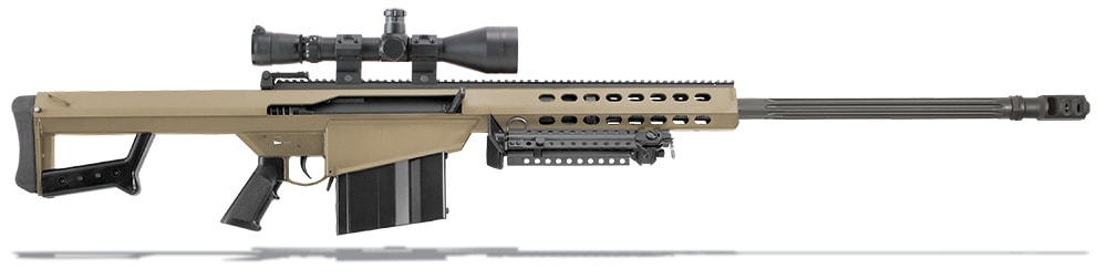 This Barrett 82A1 .416 Barrett rifle system comes with a Leupold Mark 4 M1 scope and Barrett ultra high rings. Other features include a flat dark earth Cerakote receiver, 29" fluted barrel, 10 round magazine, carry handle, bipod, monopod, and hard carrying case. The 82A1 .416 Barrett has a cylindrical 3-port muzzle brake and functions on a recoil operated design.
