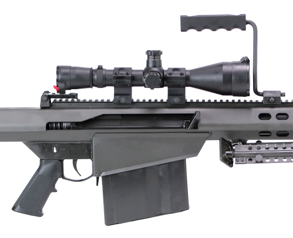 The Barrett M82A1’s semi-automatic action relies on a rotating recoil operated bolt and is available with a 20” CQB barrel or 29” long range barrel. M82A1 rifles chambered in .416 Barrett exclusively use a 29” barrel. The receiver is made from steel to ensure unparalleled durability and also to add significant weight to mitigate the powerful recoil of the .50 BMG cartridge. Barrett M82A1 rifles ship with a lightweight quick-detach bipod that allows you to fire the rifle from a supported or prone position. .50 BMG Barrett M82A1s use an arrowhead shaped 2-port muzzle break for recoil mitigation and the .416 barrel M82A1s use a cylindrical 3-port muzzle break. M82A1 comes standard with a 23” Picatinny with a 27 MOA cant.