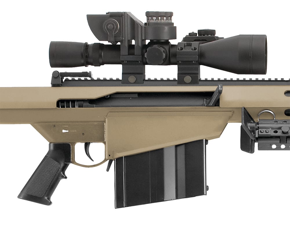 The Barrett M82A1’s semi-automatic action relies on a rotating recoil operated bolt and is available with a 20” CQB barrel or 29” long range barrel. M82A1 rifles chambered in .416 Barrett exclusively use a 29” barrel. The receiver is made from steel to ensure unparalleled durability and also to add significant weight to mitigate the powerful recoil of the .50 BMG cartridge. Barrett M82A1 rifles ship with a lightweight quick-detach bipod that allows you to fire the rifle from a supported or prone position. .50 BMG Barrett M82A1s use an arrowhead shaped 2-port muzzle break for recoil mitigation and the .416 barrel M82A1s use a cylindrical 3-port muzzle break. M82A1 comes standard with a 23” Picatinny with a 27 MOA cant.