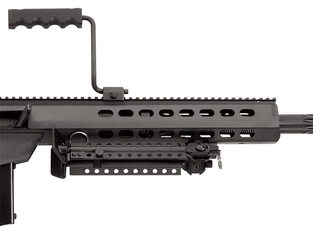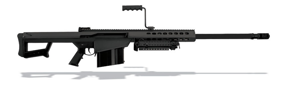 The Barrett M82A1’s semi-automatic action relies on a rotating recoil operated bolt and is available with a 20” CQB barrel or 29” long range barrel. M82A1 rifles chambered in .416 Barrett exclusively use a 29” barrel. The receiver is made from steel to ensure unparalleled durability and also to add significant weight to mitigate the powerful recoil of the .50 BMG cartridge. Barrett M82A1 rifles ship with a lightweight quick-detach bipod that allows you to fire the rifle from a supported or prone position. .50 BMG Barrett M82A1s use an arrowhead shaped 2-port muzzle break for recoil mitigation and the .416 barrel M82A1s use a cylindrical 3-port muzzle break. M82A1 comes standard with a 23” Picatinny with a 27 MOA cant.