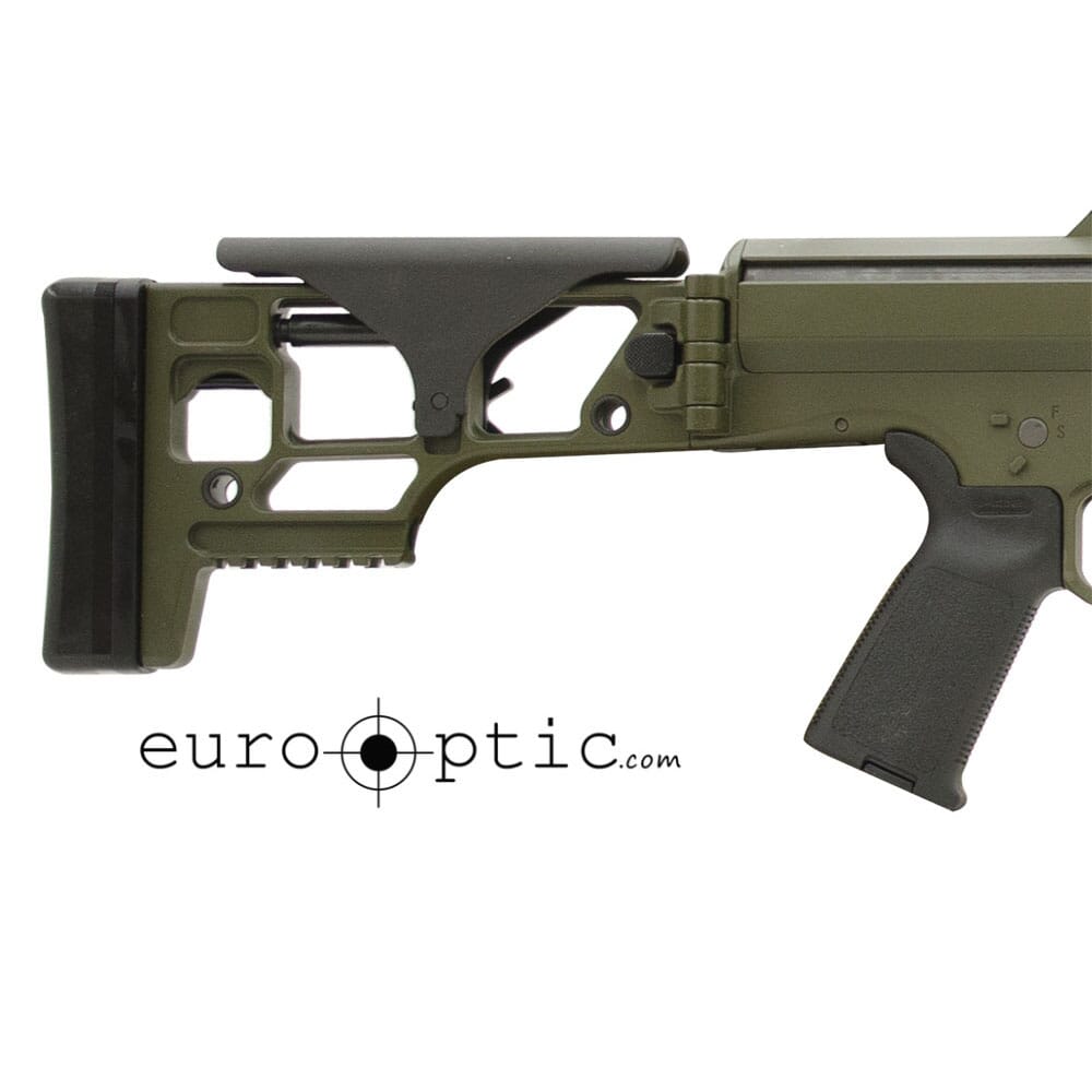 This Barrett MRAD 6.5 Creedmoor Rifle features a olive drab folding stock, 24" carbon fiber barrel, adjustable cheek piece, M1913 rail with 20 MOA taper, bolt guide for dust protection, ambidextrous magazine release, front-loading barrel design, single button length of pull adjustment, thumb-operated safety, removable combat-proof trigger module, and the ability to accept standard M4/M16 pistol grips.