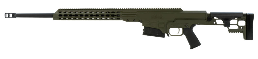 This modular Barrett MRAD .260 Remington Rifle System features a OD Green folding stock with adjustable cheekpiece, 24" heavy barrel, ambidextrous magazine release, single button length of pull adjustment, trigger module removable without tools, front-loading barrel design for caliber changes.