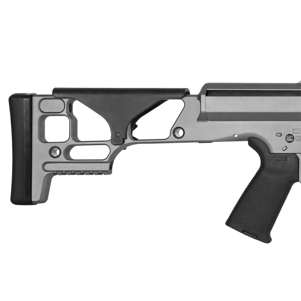 Barrett’s MRAD Single Mission Rifle or SMR delivers the same long-range performance of the standard MRAD in a simplified and more affordable package. The SMR differs from the MRAD in two ways: the buttstock is fixed and rifle is confined to a single caliber, as opposed to the MRAD’s folding stock and multi-caliber capabilities. The SMR’s streamlined design also provides a slimmer and lighter rifle, shaving off almost 2 ½ pounds and reducing the overall length by 1-inch. Aside from these minor differences, the SMR is virtually identical to the MRAD, utilizing 90% of the same parts as well as sharing a precise .75 MOA accuracy guarantee. Another feature celebrated by both the SMR and MRAD is a high level of end-user customization. A flattop picatinny rail allows an optic of choice to be mounted, and ample rail space accommodates the use of clip-on night vision and thermal devices. The SMR’s non-folding stock can also be finely tuned to the user’s preference of cheek-height, and additional spacers can be installed to fit the user’s desired length-of-pull.