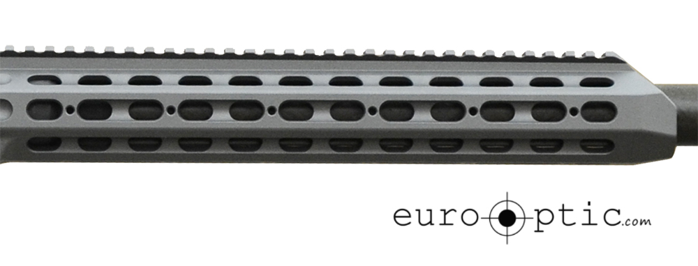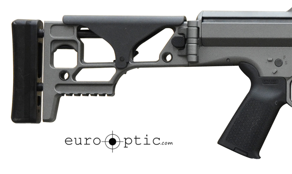 This modular Barrett MRAD .308 Win Rifle System features a gray folding stock with adjustable cheekpiece, 22" carbon fiber barrel, ambidextrous magazine release, single button length of pull adjustment, trigger module removable without tools, front-loading barrel design for caliber changes.