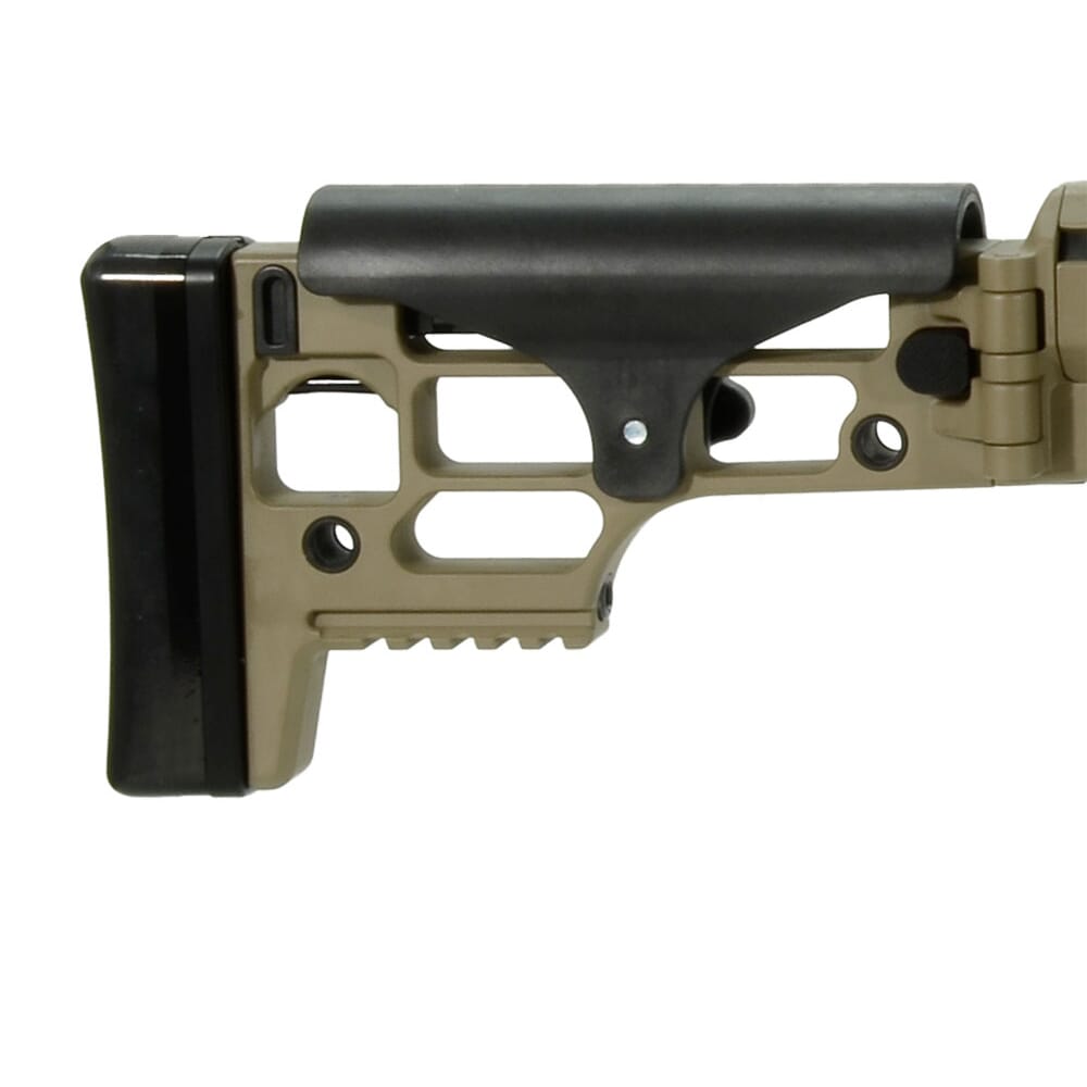 The Barrett MRAD rifle's stock is foldable for enhanced portability yet locks in as solid as a fixed stock rifle, creating a rigid platform for consistent firing. When folded, the stock latches around the bolt handle for added security during transport. Because the stock folds to the bolt handle side of the action, the rifle is the same width overall, folded or extended. Made of a temperature resistant polymer, the adjustable cheek piece also offers a consistent rifle to user contact point. The rifle's length of pull can be set to five different positions with the push of a single button. From its multi-positional quick-detach sling sockets to the Barrett Multi-Role Brown color of the rifle that blends into any environment-every detail of the Barrett MRAD has been carefully designed to create one thing: a high-performance rifle you can truly make your own.