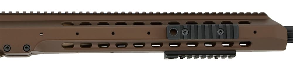 Integrated into the Barrett MRAD rifle's 7000 series aluminum upper receiver is a Picatinny M1913 rail with 20 MOA taper. At 21.75 inches, the rail offers plenty of space for in line night vision devices. Configurable side and bottom rails allow for mounting a number of other accessories.