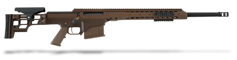 The Barrett MRAD rifle's stock is foldable for enhanced portability yet locks in as solid as a fixed stock rifle, creating a rigid platform for consistent firing. When folded, the stock latches around the bolt handle for added security during transport. Because the stock folds to the bolt handle side of the action, the rifle is the same width overall, folded or extended. Made of a temperature resistant polymer, the adjustable cheek piece also offers a consistent rifle to user contact point. The rifle's length of pull can be set to five different positions with the push of a single button. From its multi-positional quick-detach sling sockets to the Barrett Multi-Role Brown color of the rifle that blends into any environment-every detail of the Barrett MRAD has been carefully designed to create one thing: a high-performance rifle you can truly make your own.