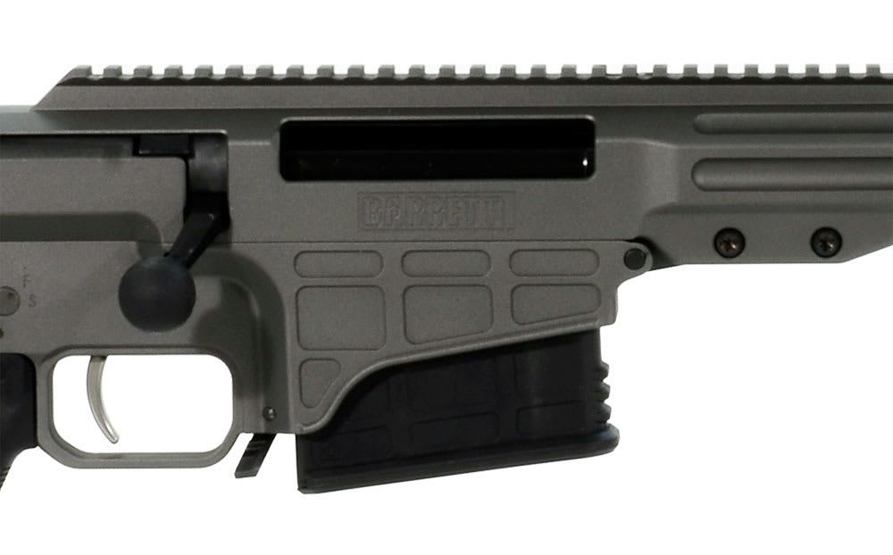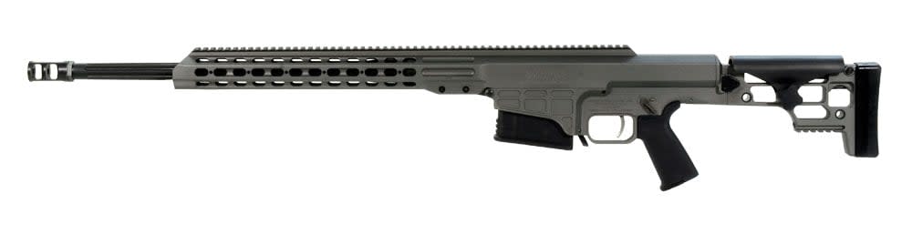 This modular Barrett MRAD 7mm Rem Mag Rifle System features a tungsten grey folding stock with adjustable cheekpiece, 24" fluted barrel, ambidextrous magazine release, single button length of pull adjustment, trigger module removable without tools, front-loading barrel design for caliber changes.