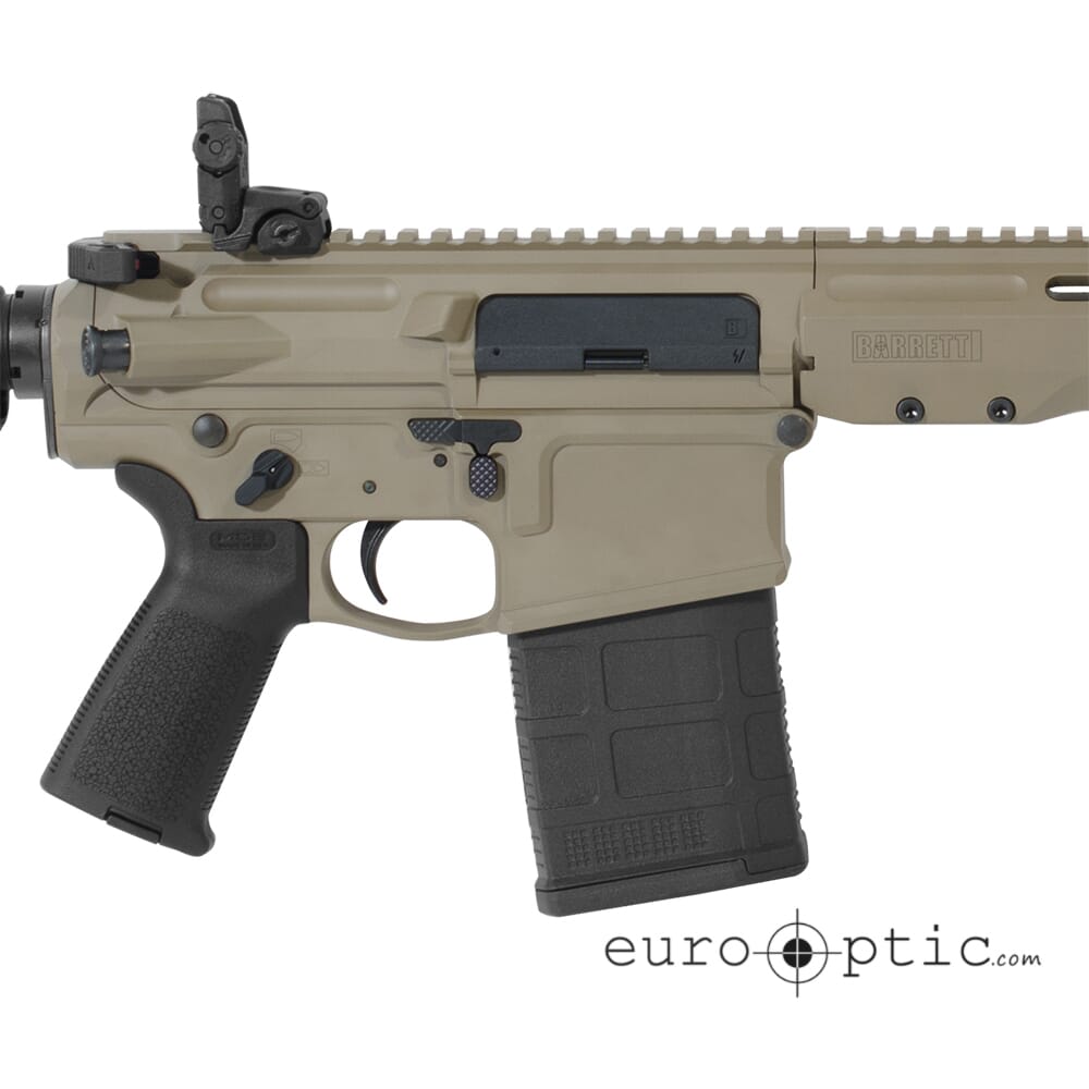 Barrett’s REC10 Rifle was developed over the course of years to ensure the utmost reliability, performance, and comes standard with exclusive features. The bolt carrier is outfitted with the Diamond-Like Carbon Coating (DLC) which provides excellent resistance to corrosion as well as a low coefficient of friction. The REC10’s trigger is the ALG Defense QMS, this trigger eliminates the grittiness associated with stock triggers but retains their renowned reliability. The trigger-guard has also been enlarged to accommodate usage even when wearing gloves. Other features of the Barrett REC10 includes a high degree of customization. A full length flattop picatinny rail allows for the installation of a magnified or unmagnified optic, and the ample rail space accommodates use with clip-on night vision or thermal devices. The handguard features multiple M-LOK attachment points for the fitting of tactical lights/lasers, fore-grips, and other accessories. In addition, the REC10 is fully ambidextrous, with the safety selector, bolt release, and mag catch located on both sides of the weapon.