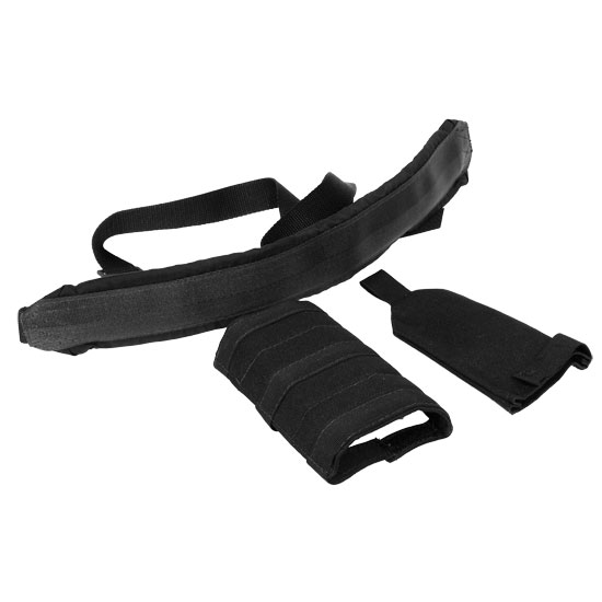This Barrett black webbing kit for 82A1 Legacy firearms includes a sling, muzzle cover, and cheek piece cover.