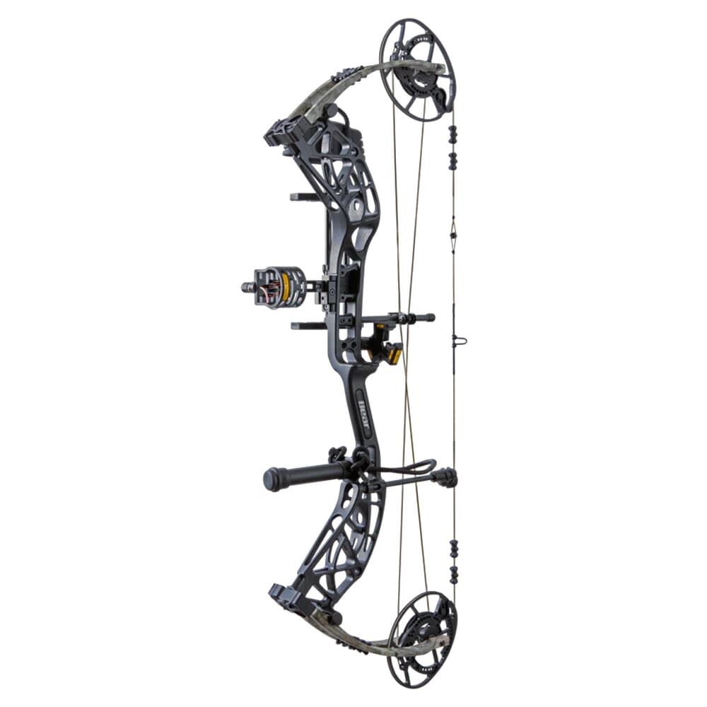 The Bear Whitetail INT RTH LH70 Black/Veil Whitetail Bow AV56A41197L is a versatile and powerful compound bow tailored for left-handed archers. Featuring the Veil Whitetail camo pattern, this bow offers excellent concealment in various terrains. With a draw weight of 70 pounds, it delivers powerful shots with exceptional speed and accuracy, achieving speeds up to 339 feet per second. The bow includes the EKO cam system, providing an ultra-comfortable 90% let-off, and features an Integrate Mounting System® rest and picatinny sight mounting locations for easy customization. The new roller cable guard system and KillerWave limb dampeners ensure a smooth and vibration-free shooting experience. Ready to hunt (RTH) right out of the box, it includes essential accessories such as a Trophy Ridge 4-pin sight, Whisker Biscuit arrow rest, Trophy Ridge 5-arrow quiver, stabilizer, peep sight, and wrist sling.
