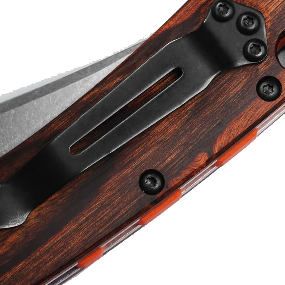 Experience the perfect blend of tradition and innovation with the Benchmade Crooked River AXIS Clip-Point Stud Knife. This folding knife is designed for those who demand both style and performance in their everyday carry. The Crooked River's striking gray aluminum handle is accented with elegant wood inlays, creating a look that's both modern and timeless. The knife's AXIS locking mechanism offers a smooth, secure, and ambidextrous operation, making it a reliable companion for both outdoor adventures and daily tasks. The ergonomic handle ensures a comfortable, confident grip, while the premium clip-point blade is engineered for precision, making it ideal for a wide range of cutting tasks. Whether you're in the field, on the trail, or tackling everyday challenges, the Crooked River is a versatile tool that's as functional as it is eye-catching.