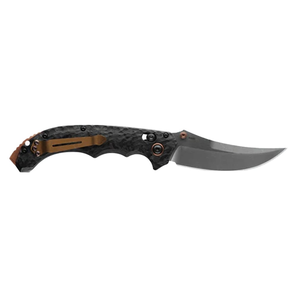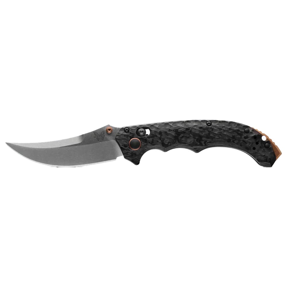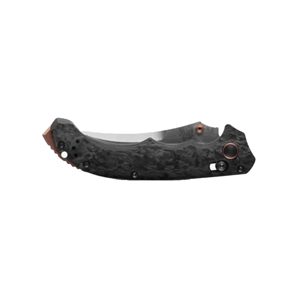 The Benchmade Mini Bedlam AXIS Scimitar Carbon Fiber Knife 865-02 is a masterful blend of modern engineering and classic design, tailored for those who demand both style and substance in their everyday carry. Inspired by the iconic Scimitar, the blade's sweeping curve is engineered for exceptional control and precision, making it a reliable companion for a wide range of cutting tasks. The carbon fiber handle not only delivers a striking, contemporary aesthetic, but also ensures the knife remains lightweight and easy to handle, even during extended use. Benchmade's renowned AXIS locking mechanism provides a smooth, ambidextrous deployment and a rock-solid lockup, instilling confidence in every use. Crafted with meticulous attention to detail and premium materials, the Mini Bedlam is built to withstand the rigors of daily use, making it a trusted tool for those who value performance and reliability in a compact, elegant package.