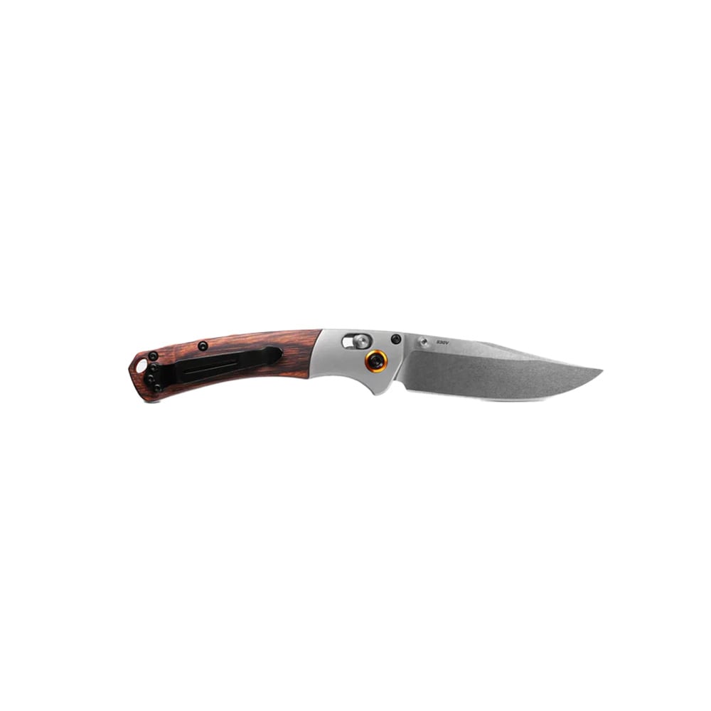 The Benchmade Mini Crooked River 15085-2 is a masterful blend of modern engineering and classic style, designed for those who demand reliability and elegance in their everyday carry. This knife is a testament to Benchmade's commitment to quality, featuring a robust construction and a refined aesthetic. The Mini Crooked River's compact profile makes it a discreet yet capable companion, whether you're in the city or the great outdoors. The knife's ergonomic handle, accented with wood inlays, offers a comfortable and secure grip, while the precision-crafted blade is ready to tackle a variety of cutting tasks with ease. This is a knife for those who appreciate the fusion of tradition and innovation, and who value a tool that's as versatile as it is striking in appearance.