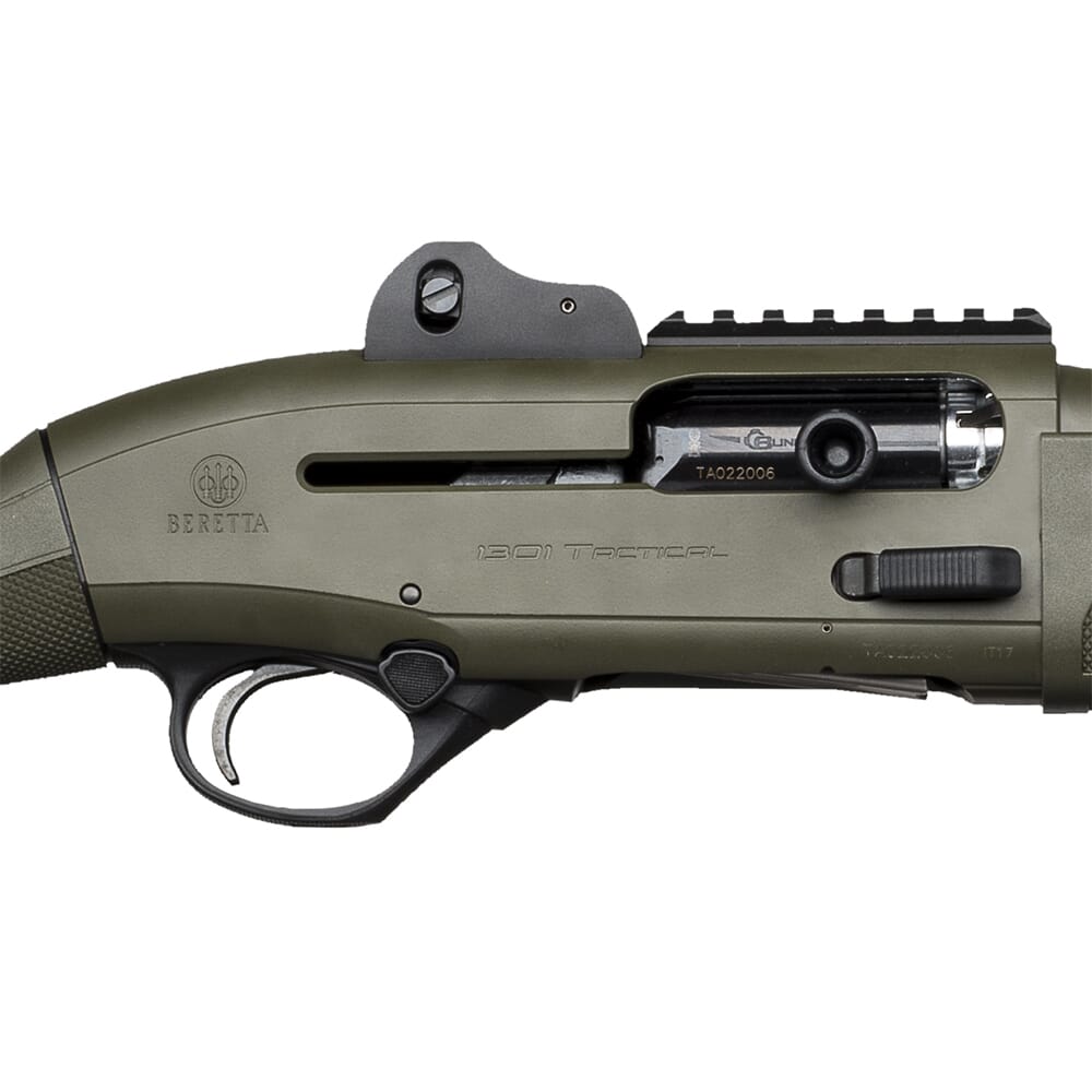 The 1301 Tactical is a semiautomatic gas-operated tactical shotgun manufactured by Beretta, with home-defense and law enforcement applications in mind. The short, 18 ½” barrel gives it a compact size and makes it ideal for engaging targets while in confined spaces. In addition to its effectiveness in close-quarters, the 1301 Tactical was built to be extremely reliable and easy to use. It sports a large textured bolt release, an oversized charging handle, and a hefty safety button that can be switched from side to side. The amplified checkering around the grip and fore-end ensures the operator will have a consistent grip on the weapon, even when wearing gloves. Aside from its ease of use and close range capabilities, the 1301 Tactical is a highly customizable platform; the ghost-ring sight system has a replaceable front sight, the choke is interchangeable, and a receiver mounted MIL-STD Picatinny rail allows for the installation of optics.