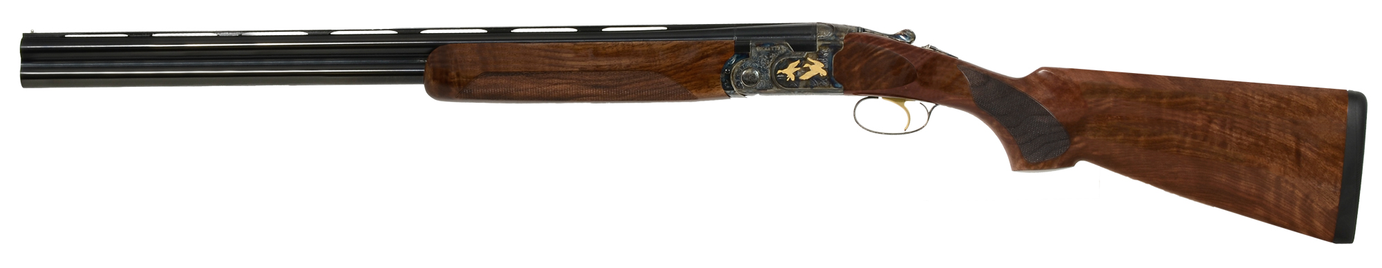 This over-under Beretta 687 Silver Pigeon V 12-gauge shotgun with a 26" barrel has a deeply-textured color-case finished action with hand-inland gold game scenes and the Beretta gold medallion. The stock of the 687 Silver Pigeon V is made of highly-figured, oil-finished select walnut and contains an oval to be personalized with the owner's initials or family crest. Built for strength, this over-under also features two conical locking lugs, chrome-moly cold-hammer forged barrels, a MobilChoke system to resist stress, and an elongated forcing cone for less recoil.