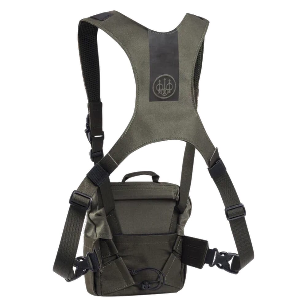 Modular Binocular Harness. Holds 10x42 and 8x56 binoculars. Fully adjustable padded shoulder straps. Easy one-hand opening. Laser-cut MOLLE panels on the front, sides, and bottom. Safety straps for binoculars. Shock-absorbing EVA inserts. Fitted with an elasticated laser rangefinder pocket with MOLLE interface.
