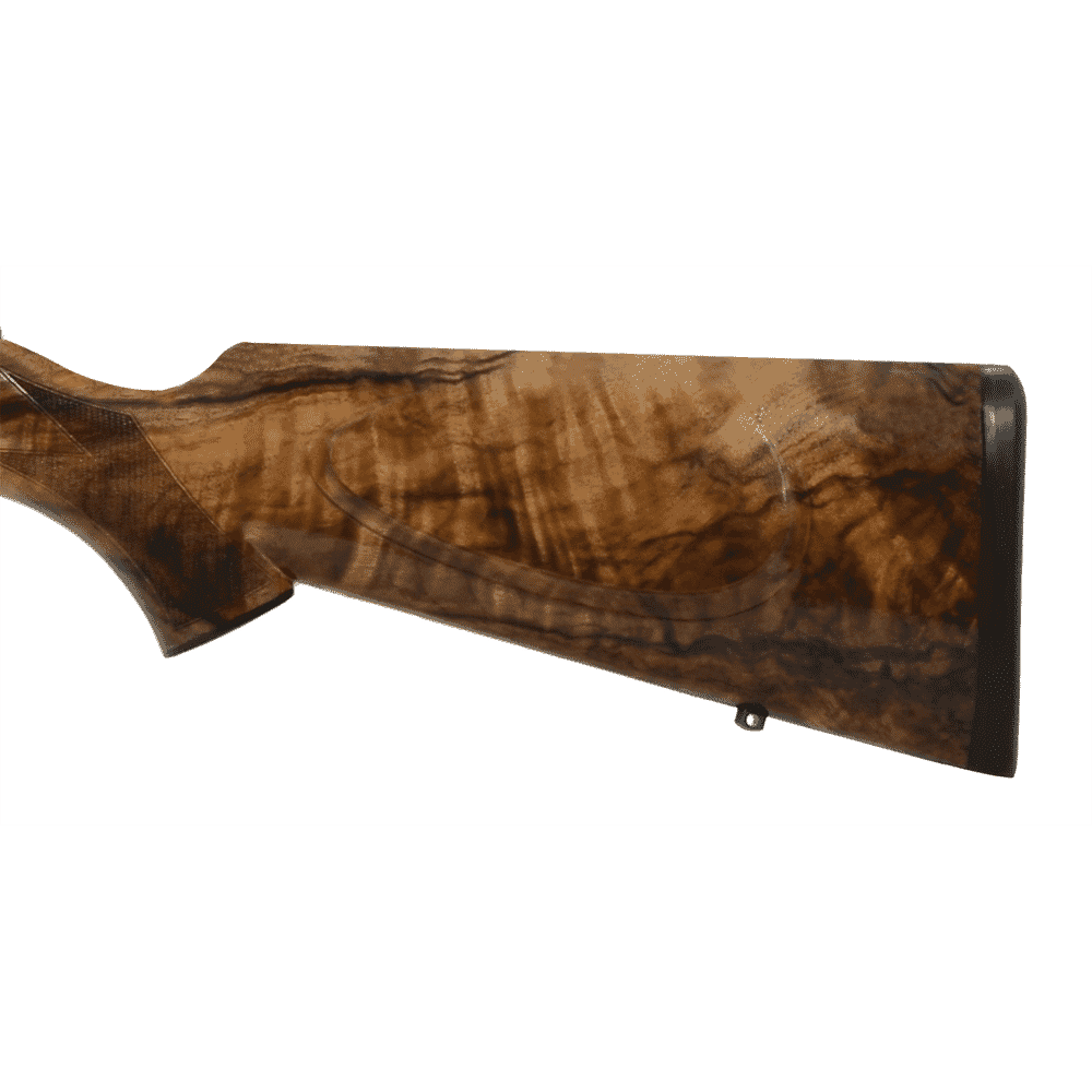 The Blaser R8 Classic Sporter rifle features a grade 7 wood classic silhouette stock, Prince of Wales grip, rigby style cheek piece, rubber recoil pad, and a "Classic Sporter" pistol grip cap.