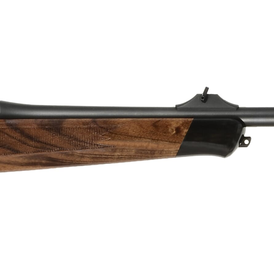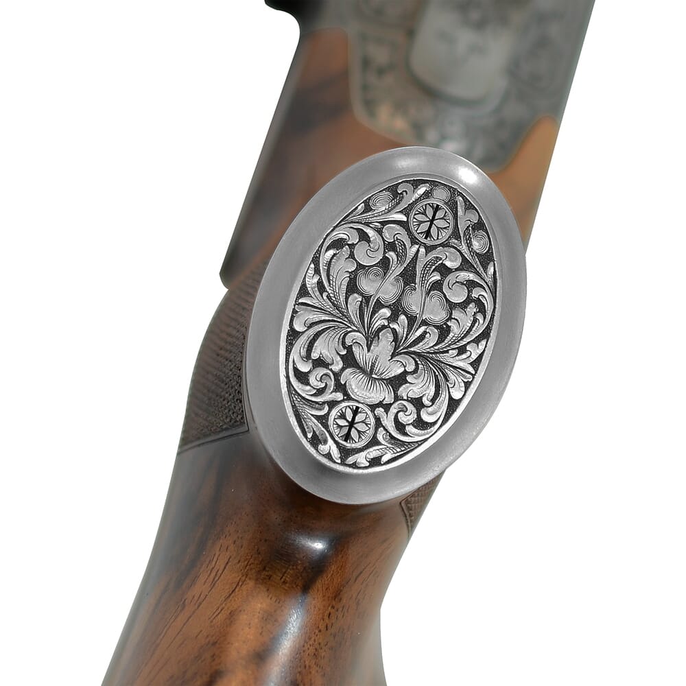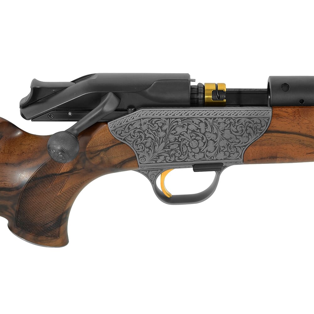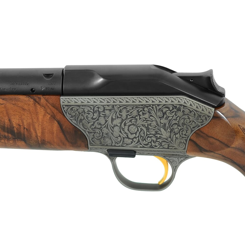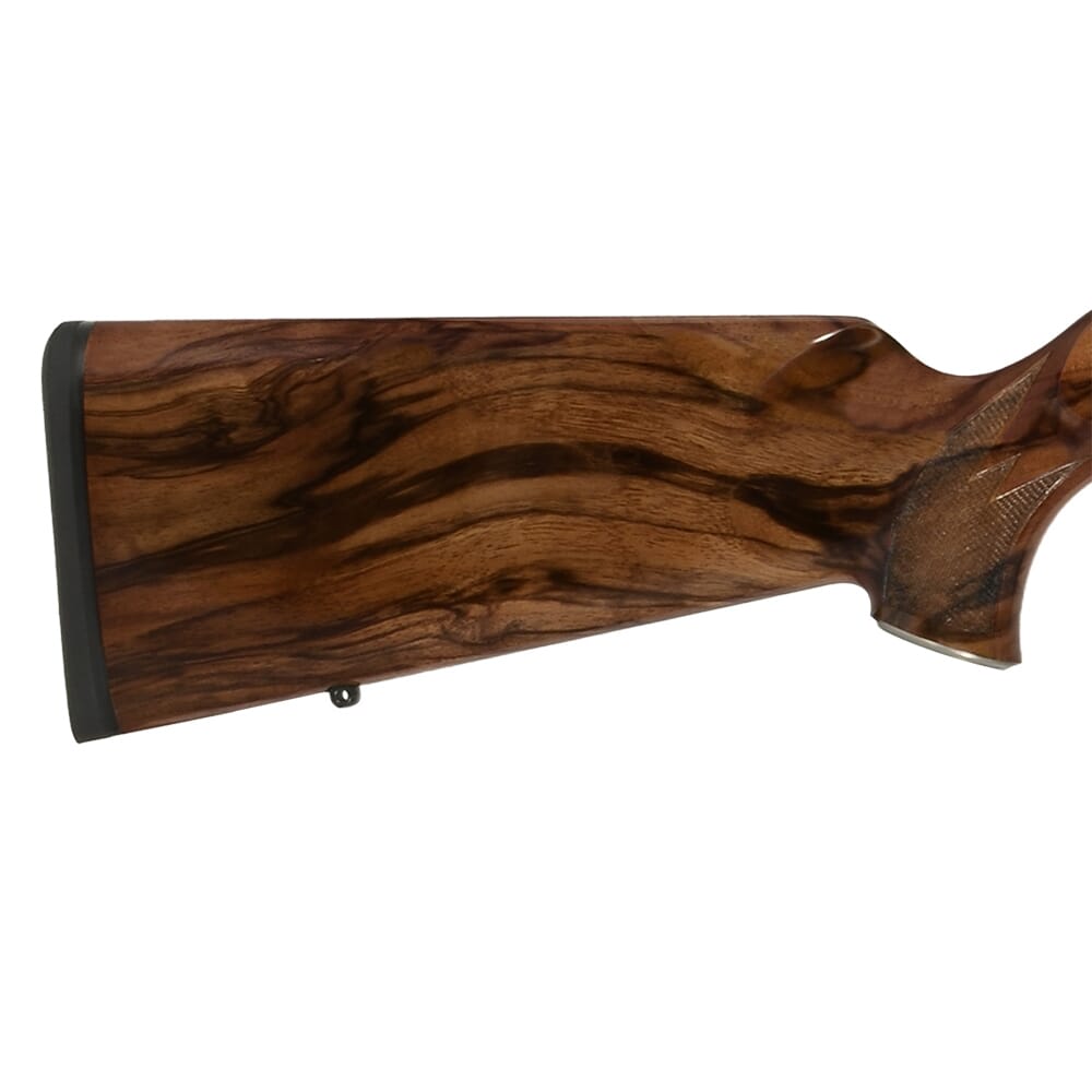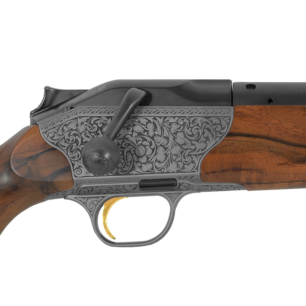 This Blaser R8 Custom I 300 Win Mag rifle features a flat hand engraved scroll, titan nitrided locking bolt, steel bolt handle ball with flower and checkering, gold colored trigger, wood grade 6 stock, and a pistol grip cap.