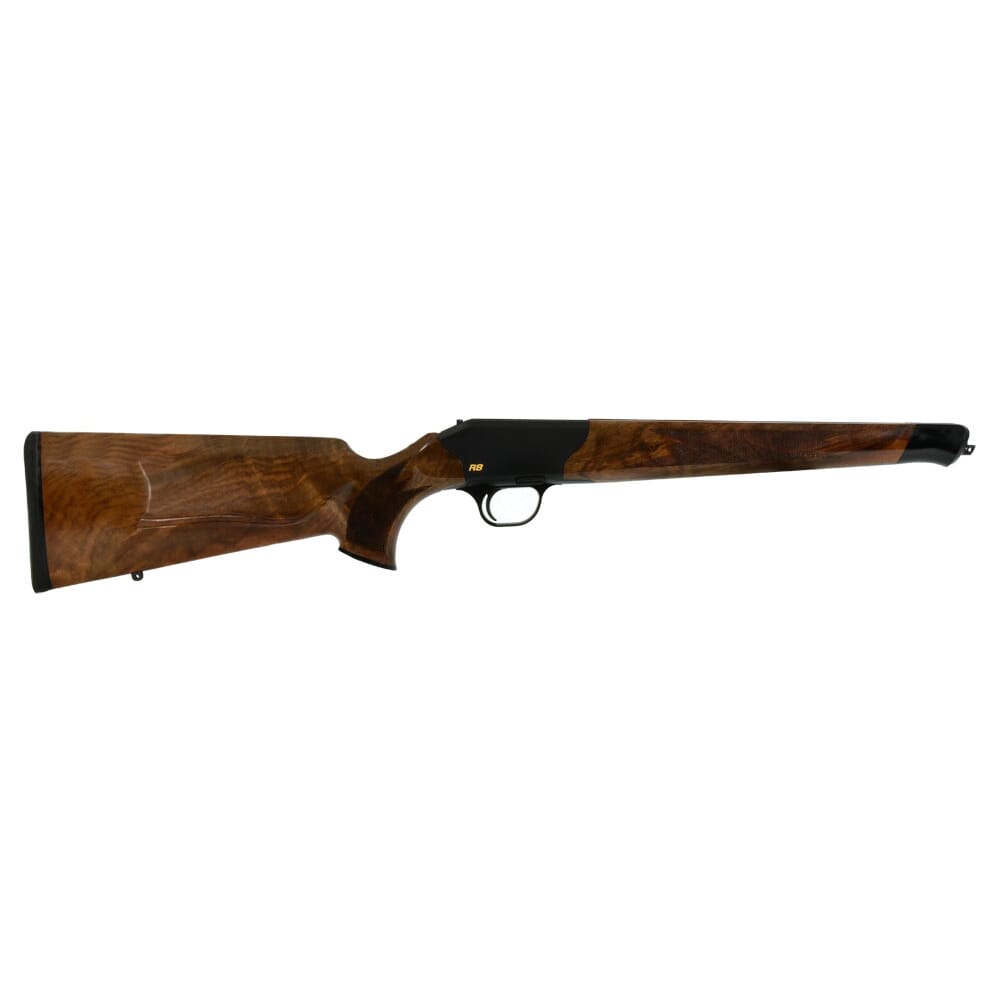 Upgrade your R8 rifle with a Jaeger stock receiver. The sleek Blaser R8 Jaeger features a Bavarian cheek piece with double rabbet, rubber recoil pad, black synthetic forearm tip, and a walnut wood grade 3 stock.