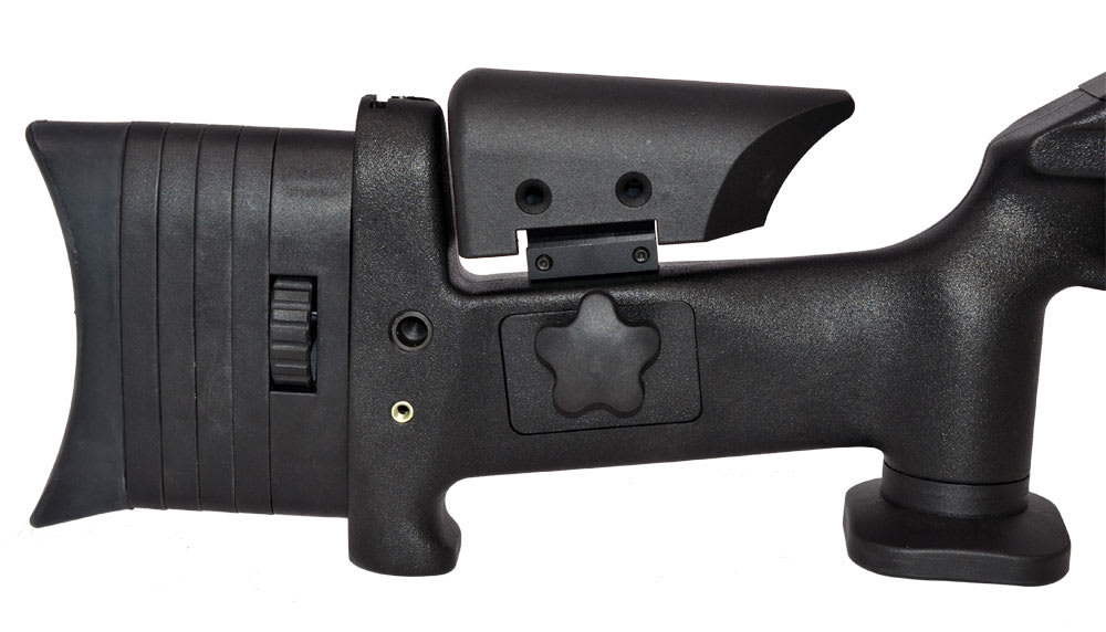 The ergonomically correct stock is injection molded out of fiber reinforced polymers and is absolutely stable, even under extreme temperatures. The butt plate and cheek piece are adjustable for length and height. The pistol grip has a base plate for maintaining hand position. The stock features an optional rear rest for setting rifle elevation during prone shooting. The stock includes sling swivel disconnect points and an adapter rail for mounting a bipod. The stock is ambidextrous and all components can be mounted on either side.