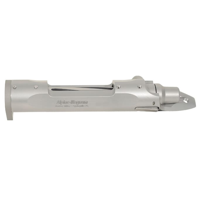 The Borden Alpine Action is a direct Rem 700 drop-in short action. This right-hand, Rem .308 Borden Alpine Magnum short action has a standard handle and an extended port magazine well. Other features include a hardened stainless steel action body, hardened and ground 4140 bolt body, thread milled 8x40 blind scope block holes, thread milled 1/4x28 guard screw holes, and medium Sako style extractor installed with plunger positioned for low ejection angle.