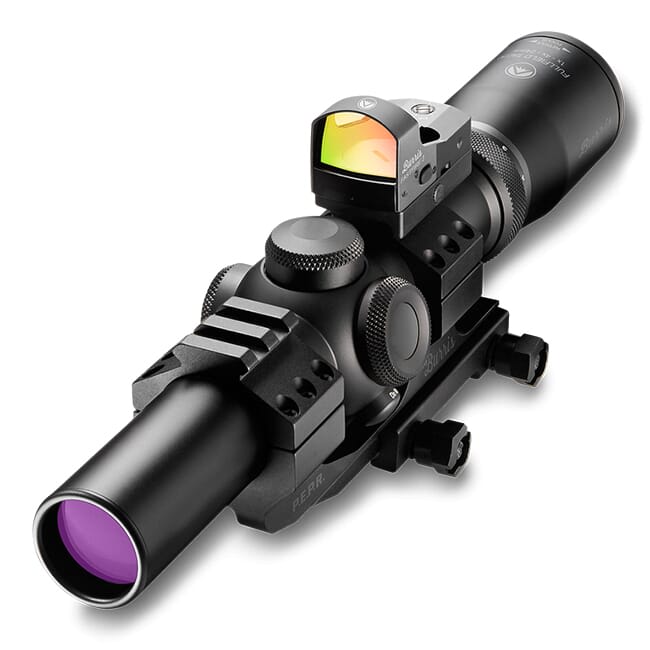 The Burris Fullfield Tac30 has an illuminated center dot for close distances and holdover dots for trajectory compensation out to 600 yards. The 1X magnification is for close-in, both eyes open while the 4X magnification is for mid-distance targets. Other features include a 10-position dimmer for adjusting in all lighting conditions and multi-coated optical glass for glare resistance.