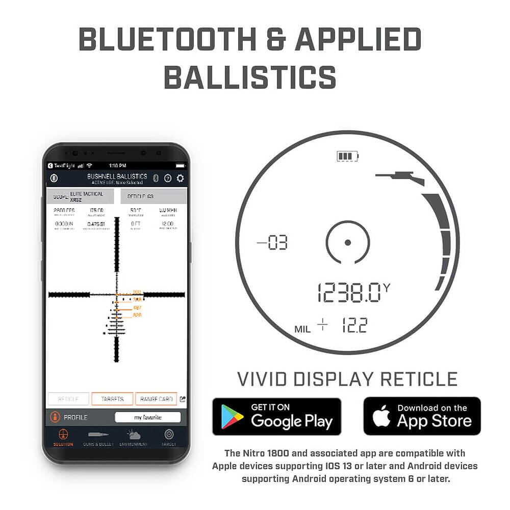 The Nitro 1800 by Bushnell is a Laser Rangefinder powered by Applied Ballistics that can provide a ballistic solution up to 800 yards away and can be upgraded to over 2000 yards away. The Nitro 1800 can range, acquire holdovers, get wind adjustment, and configure ballistics data with its on board software. Its Bushnell Ballistic app is Bluetooth compatible with the Apple IOS 13 smartphones and Android smartphones with operating system 6 or later as well as Kestrel’s weather meter.
