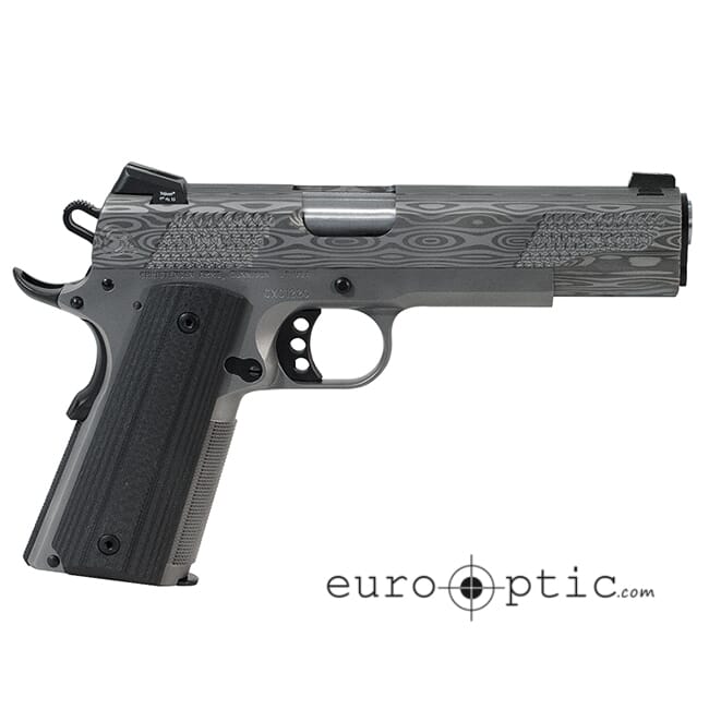 This 9mm Christensen Arms Government 1911 pistol features a titanium construction, 5" Damascus slide, VZ G10 grips, aerospace aluminum mainspring housing, adjustable trigger, and Tritium night sights.