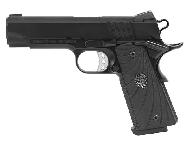 This 1911 style Cabot S103 Commander .45 ACP pistol features a black nitride frame and slide, 24 lines-per-inch rhombus cut checkered front strap, 4.25" barrel and bushing, lowered and flared ejection port, trinity stripes serrations, aluminum TriStar trigger, beavertail grip safety, thumb safety, rhombus checkered mainspring housing, engraved star on guide rod, front blind sight, fixed rear sight, top slide arrow serrations, G-10 scallop Fibonacci grips.