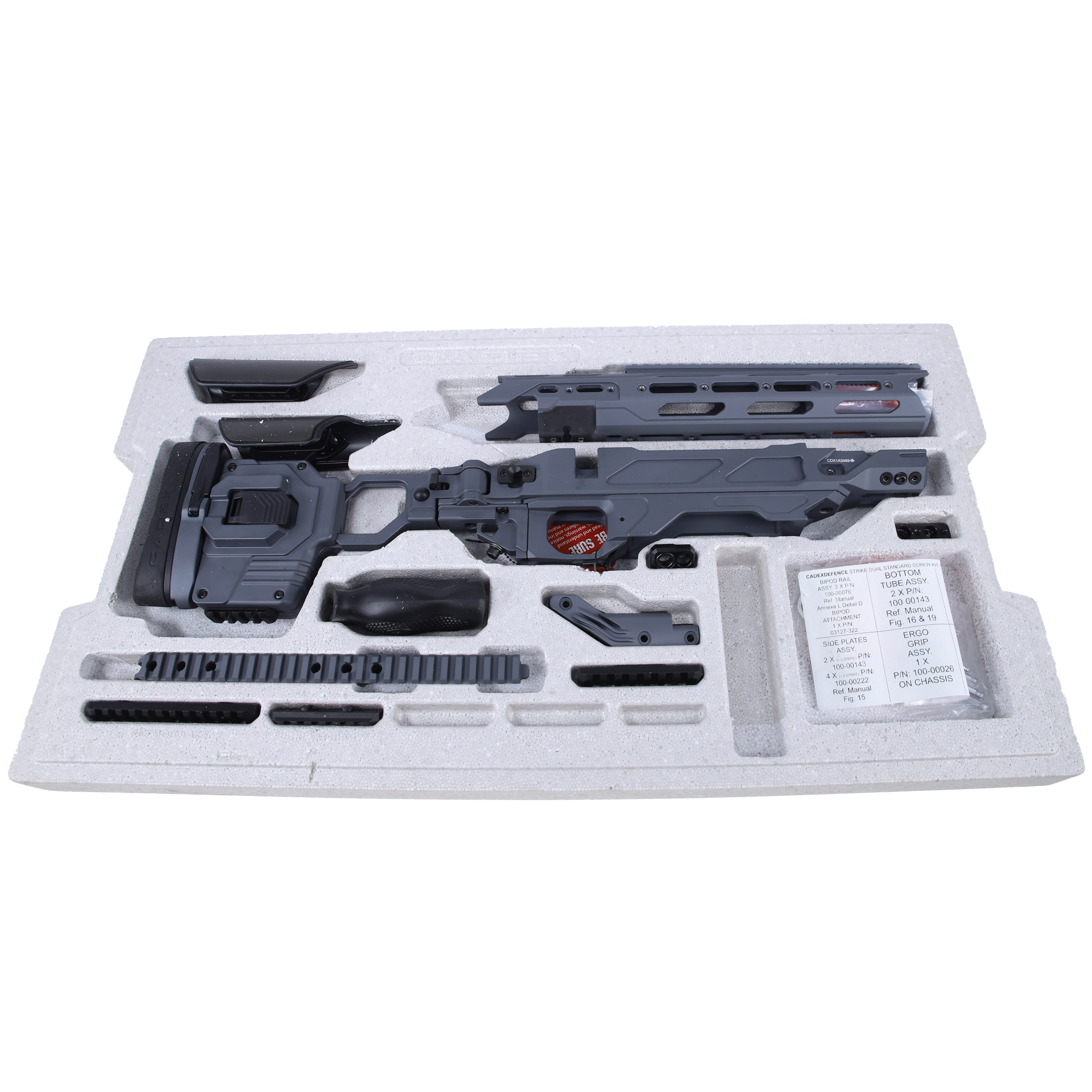 The Cadex Dual Strike Chassis is a precision-engineered folding rifle chassis system designed for long-range, heavy-caliber applications. Built from rugged 6061-T6 aluminum and finished in a non-reflective Sniper Grey, this chassis is compatible with Stiller TAC-338 actions and tailored for .375 CheyTac and .408 CheyTac calibers. Its reverse-folding stock, M-LOK compatible forend, full-length 20 MOA top rail, and fully adjustable length of pull and cheek riser make it an elite choice for professional marksmen and extreme long-range shooters. Whether in the field or at the range, the Dual Strike offers unmatched durability, modularity, and ergonomic customization.