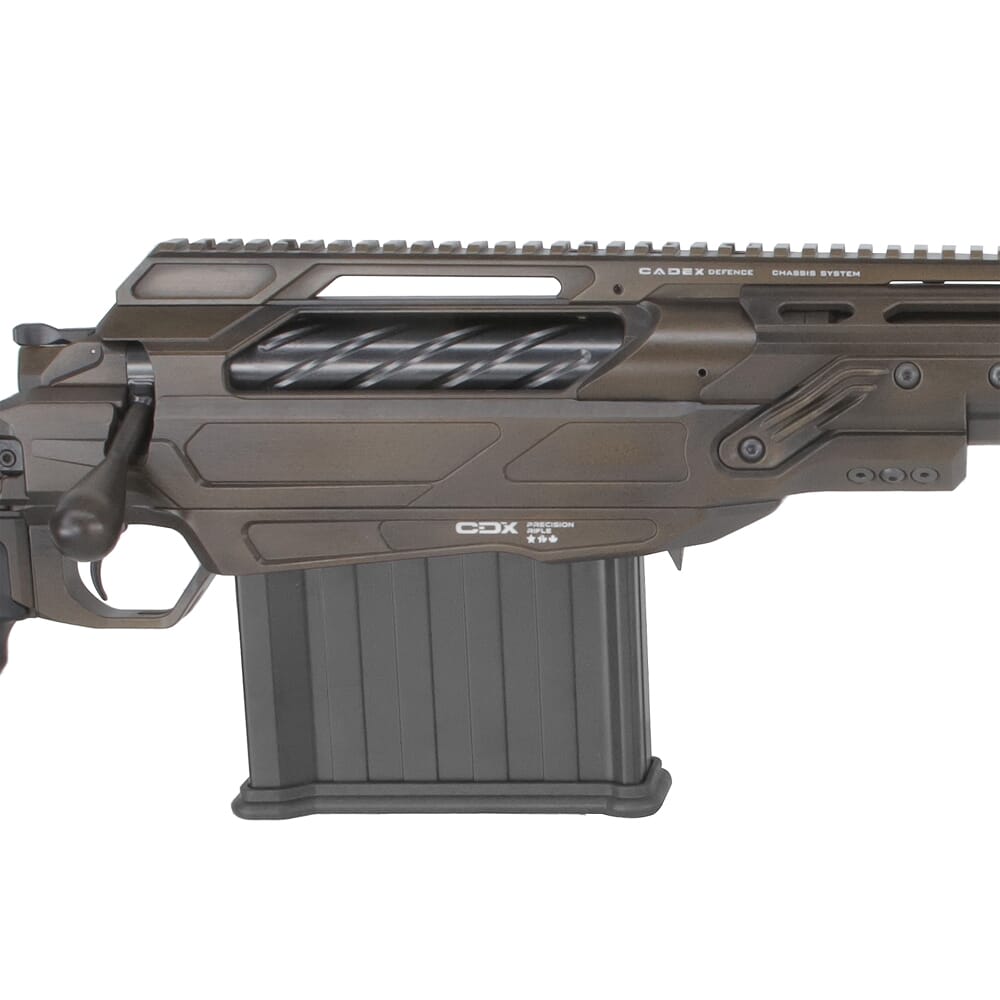 The Cadex CDX-50 Tremor is a precision rifle built to deliver the .50 BMG payload with extreme accuracy at extended ranges. The Tremor Rifle is surprisingly lightweight considering its size and chambering but still is able to mitigate felt recoil due to the muzzle brake and chassis design. The receiver is machined from 416 stainless steel, Cerakote finished, and it overbuilt for maximum durability. The bolt is also machined from 416 stainless and features 4 lugs, 2 Remington style ejectors, and a heavy duty extractor for unequivocal reliability. The triple lug recoil system ensures that all energy produced by the .50 BMG round is equally dispersed into the chassis system. The CDX-50 Tremor features Cadex’s DX2 Evo Trigger that is factory set to two stage operation but can be configured to single stage operation based on the preference of the shooter.