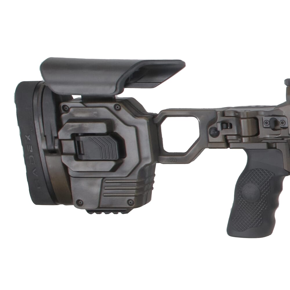 The CDX-50 Tremor .50 BMG Rifle chassis is ergonomic and customizable with features designed specifically for the long range shooter. The buttstock of the rifle allows for tool-less adjustments to be made to the length of pull, cheek piece height, and butt pad height. Additionally, the buttstock folds for compact storage and transport as well as bolt handle protection. The forend of the chassis is designed to help eliminate the effects of image distortion due to barrel heat. In addition to the full length top optics rail on the CDX-50 Tremor, the forend of the rifle features M-LOK attachment points at the 3, 6, and 9 o’clock positions.