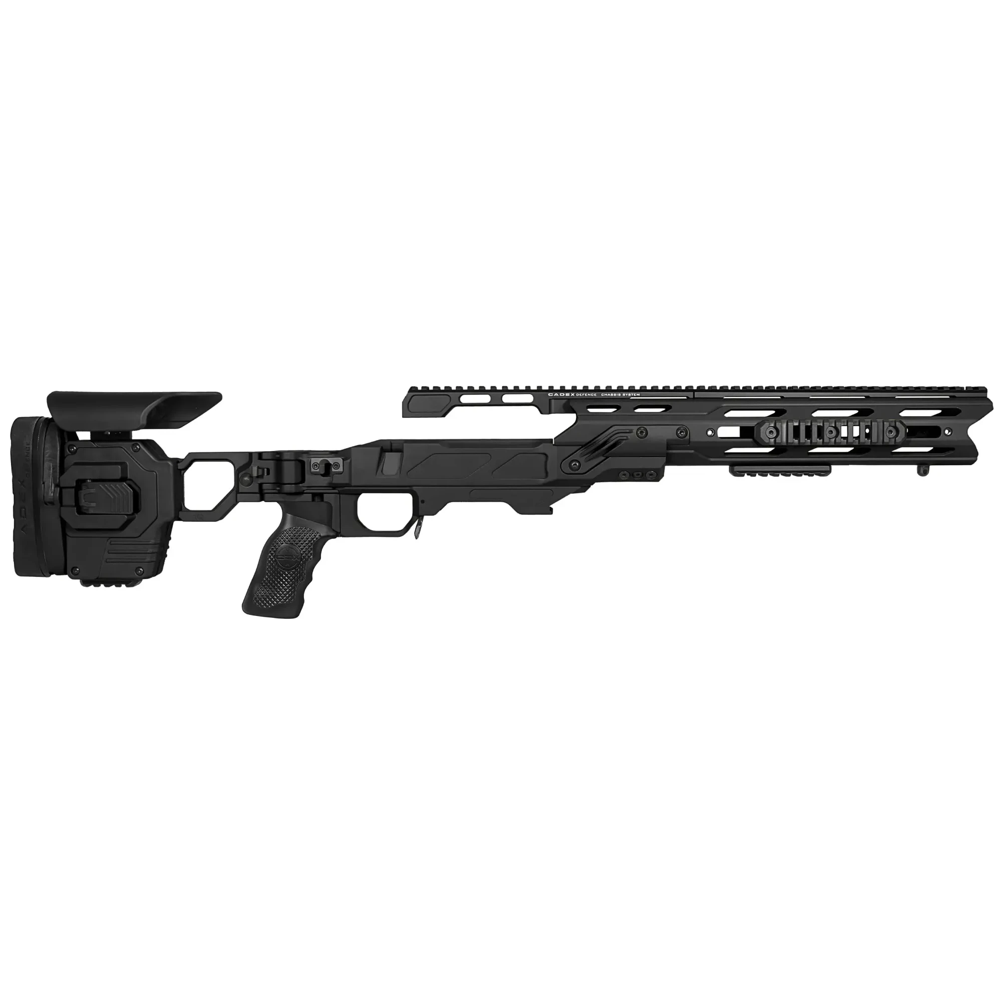 The Cadex Dual Strike 1.600" Chassis is a right‑hand precision rifle chassis engineered for bolt‑action builds using Stiller‑pattern actions and chambered for big‑bore cartridges such as .375 CT and .408 CT. Machined to accept up to 1.600" diameter barrels and optimized for Cadex detachable‑box‑mag (DBM) integration, this chassis offers adjustable length‑of‑pull and cheek riser adjustments (XL6/S stock sizing) for precise shooter fit and repeatable optic alignment. Finished in a durable bronze coating, it’s built for ELR, hunting, and long‑range competition where stiffness, repeatable mag seating, and ergonomics matter. Confirm exact Stiller model compatibility, whether the DBM/magazines are included, and the finish type (Cerakote vs anodize) with Cadex or your distributor before purchase.