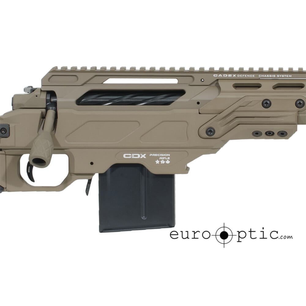 The Cadex CDX-Lite Rifle combines a wide array of mission critical features into one long range sniper rifle. Depending on the caliber, the CDX-Lite features one of Cadex’s the custom actions: the CDX-30 Guardian Action (short action calibers), the CDX-300 Freedom Action (.300 Win. Magnum), or the CDX-33 Patriot (.300 Norma Magnum, .338 Norma Magnum, or .338 Lapua Magnum). All three action types are CNC/wire EDM machined from 416 Stainless Steel and are cerakoted. The bolt utilizes 3 lugs, allows for a 60° bolt throw, and is fluted for weight reduction. Each CDX-Lite rifle is outfitted with a Bartlein straight taper match grade barrel that has been fluted for weight reduction and increased barrel cool down. Additionally the barrel of Cadex’s CDX-Lite is 5R Single Pointed rifled for unparalleled accuracy. The rifle features Cadex’s own DX2 Evo Two Stage trigger than can be easily converted to a one stage trigger based on the shooters preference.